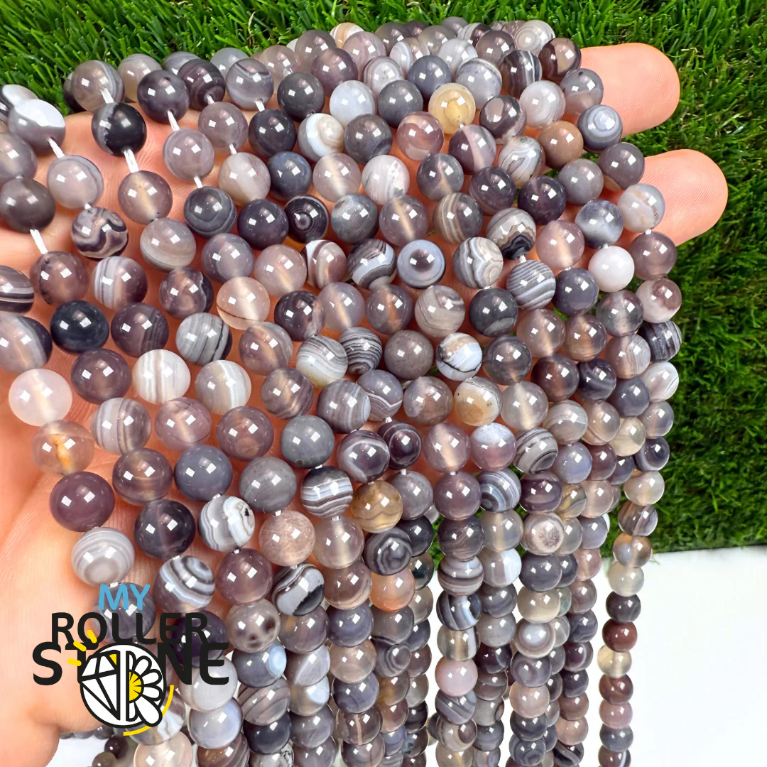 Perles naturelles d’Agate de Botswana de grade 3A, reconnues pour leurs nuances grises, roses et brunes, ornées de magnifiques bandes fines et régulières. Pierre d’équilibre émotionnel et d’apaisement profond, l’Agate de Botswana est très appréciée pour sa douceur visuelle et son énergie réconfortante.